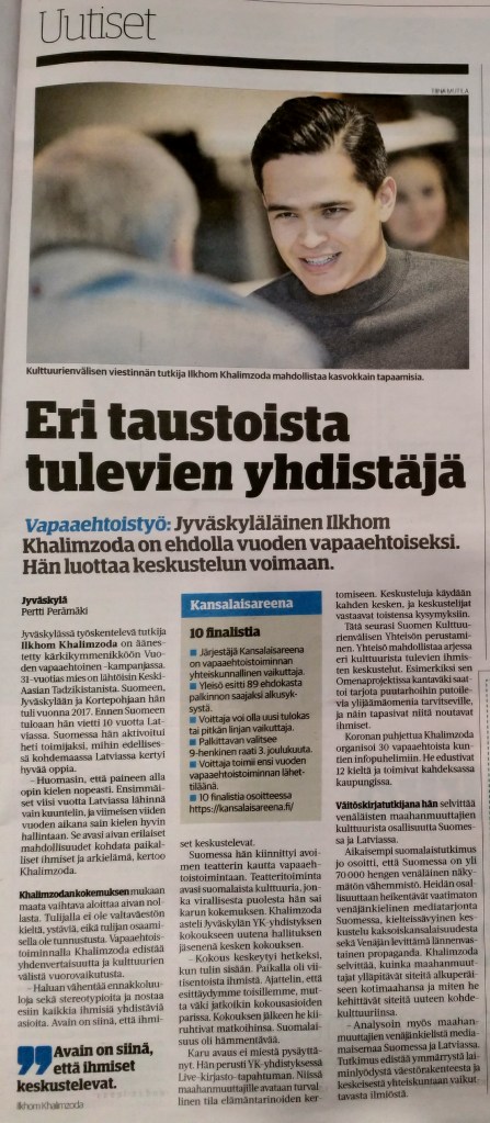 Interview with Ilkhom Khalimzoda features his current research work in Finland, and how he promotes intercultural interaction by his research and volunteer work. Regional Newspaper Keskisuomalainen, 15.11.2021, p-3.
